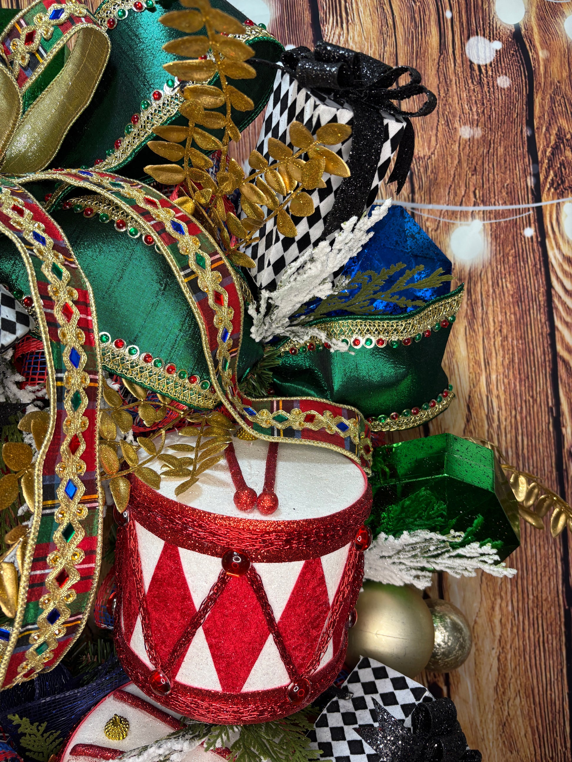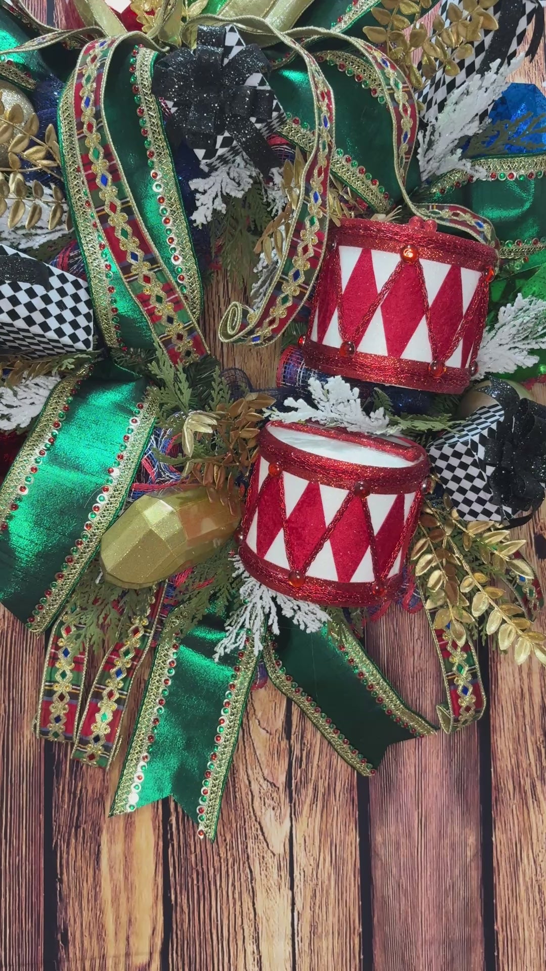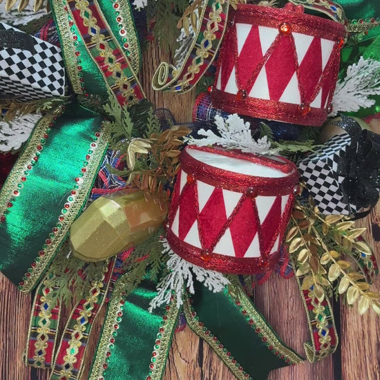 - Nutcracker Inspired Drums: Featuring red and white drums- adding a charming, whimsical touch to the wreath.